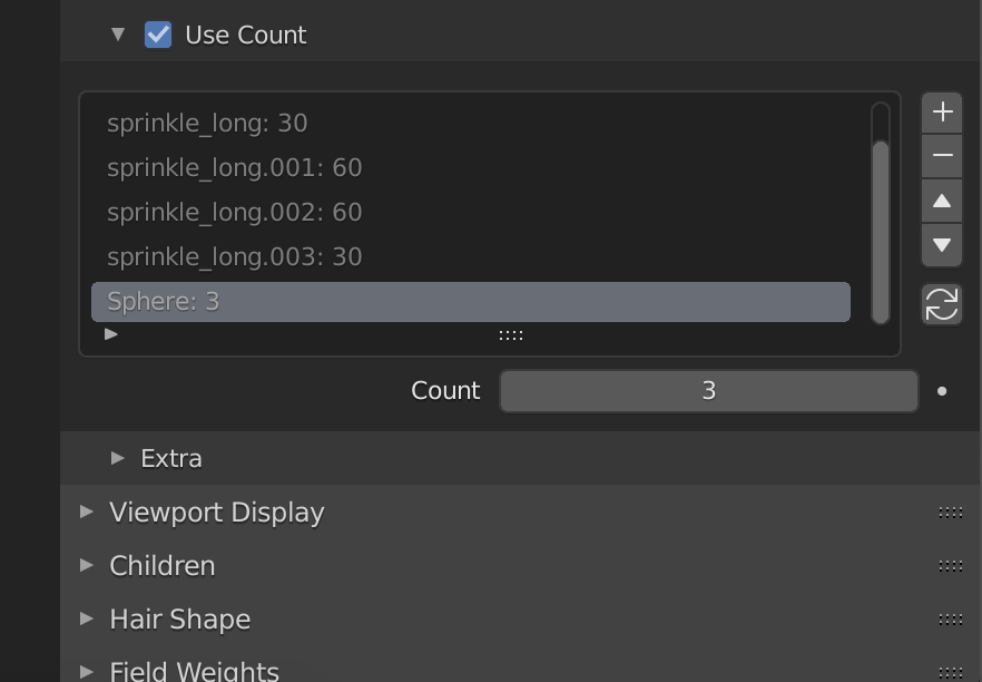 기본적으로 길쭉한 스프링클들을 뿌리고 동그란 구 형태의 스프링클은 조금만 뿌릴 거니까 30 60 3 정도의 비율로 설정해준다.