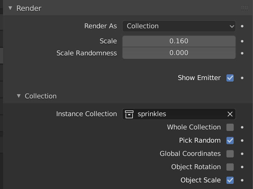 Pick Random을 안 켰더니 구 형태의 스프링클 같은 것들은 뭉쳐있는 걸 볼 수 있었다.