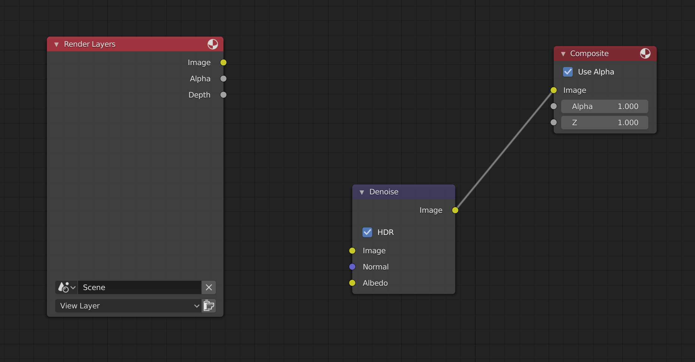 디노이즈 창의 노란 이미지 점과 Composite 창의 노란 이미지 점을 연결해 주면 디노이즈가 적용된다.