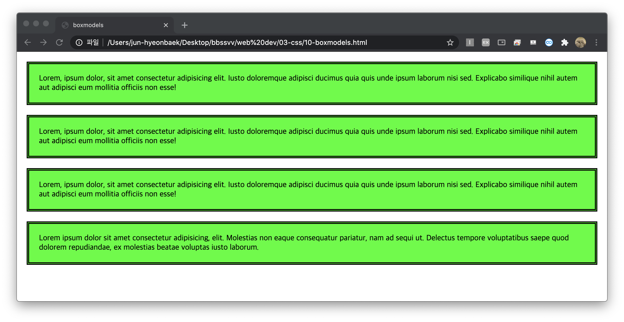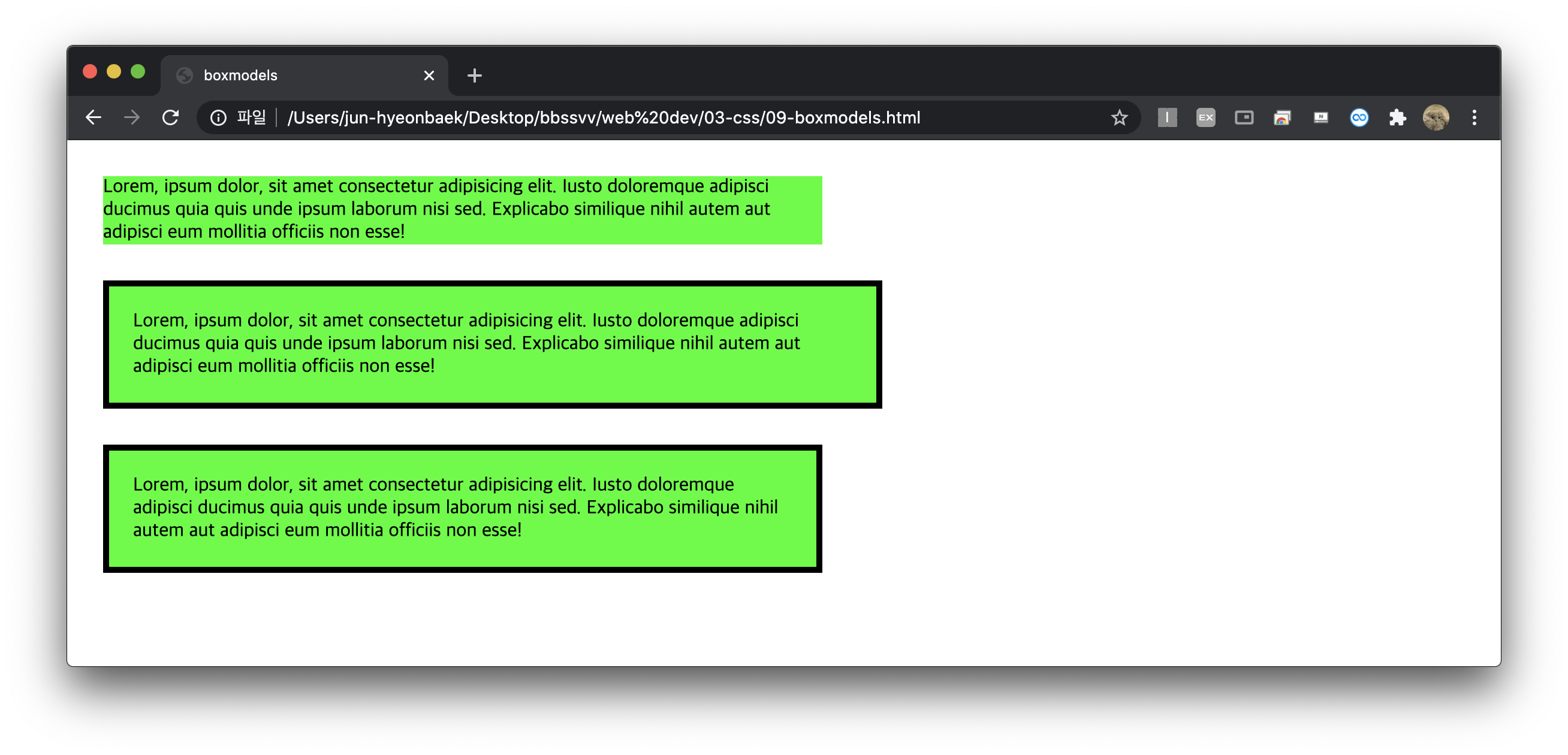 이걸 안 쓰면 두 번째처럼 컨텐츠값은 width에 고정되고 패딩값 따로 보더 두께값 따로 적용되서 더 길어짐