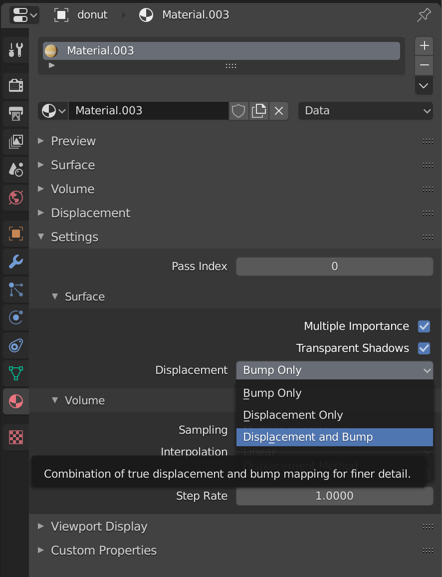 오른쪽 Material탭에서 Settings - Surface - Displacement 부분을 보면 Bump Only 라고 되어있을텐데