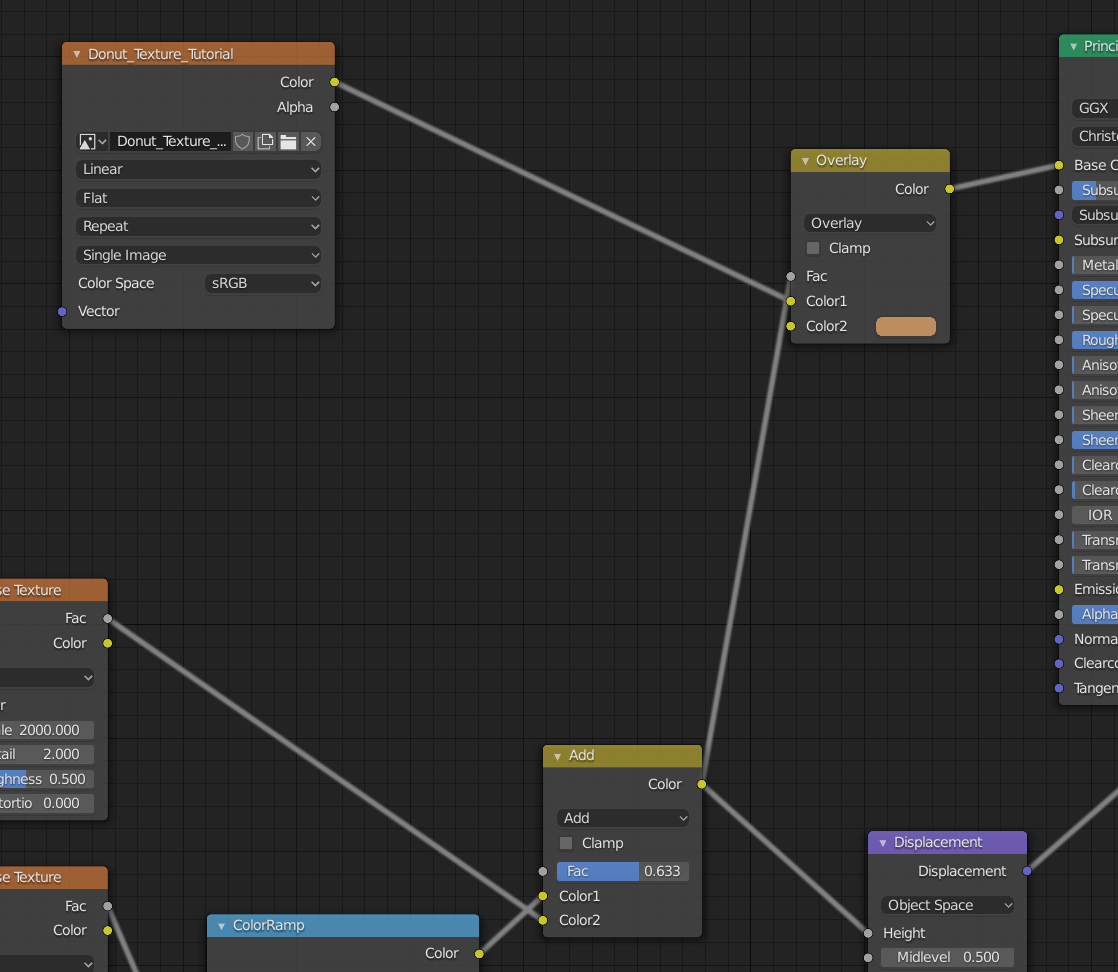 Fac에 크게 작은 울퉁불퉁을 합치고 ColorRamp까지 합친 Mix RGB 노드의 Color를 연결한다.