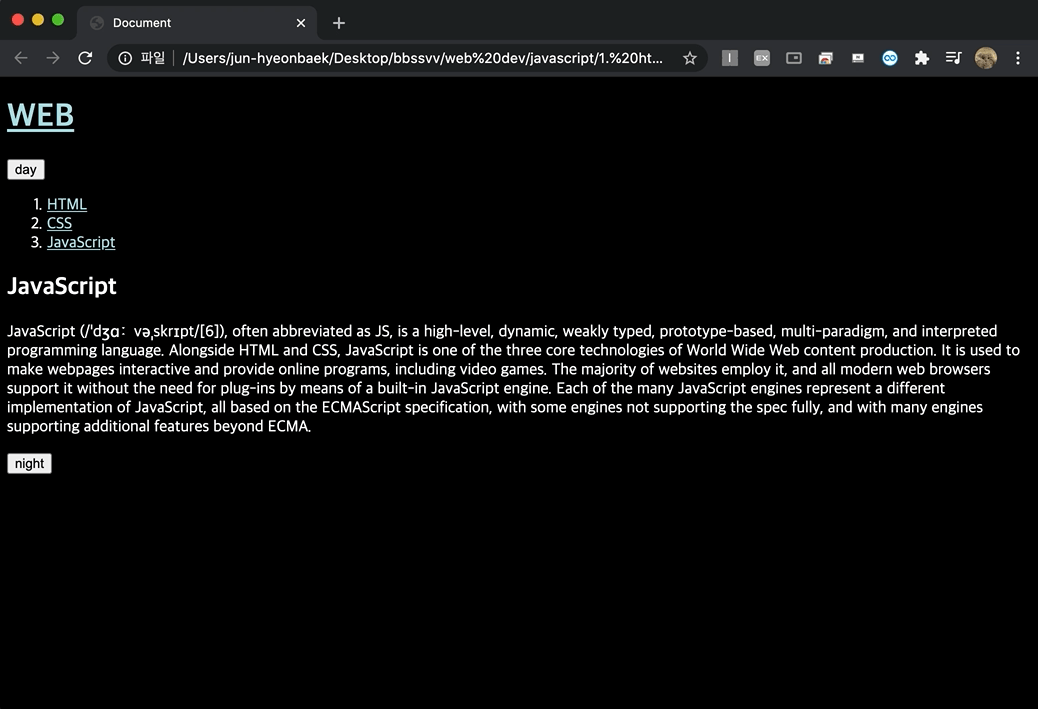 위의 움짤처럼 버튼을 클릭하면 배경과 텍스트 색이 바뀌고